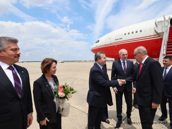 Cumhurbaşkanı Erdoğan'ı, Andrews Askerî Hava Üssü'nde, Türkiye Büyük Millet Meclisi (TBMM) Başkanı Numan Kurtulmuş, Türkiye'nin Washington Büyükelçisi Sedat Önal, Cumhurbaşkanlığı Savunma Sanayii Başkanı Haluk Görgün ve diğer ilgililer karşıladı.