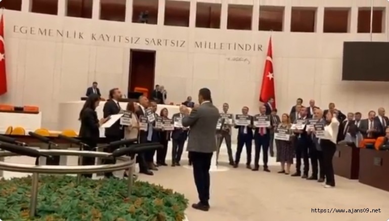 Parlak'ın konuşmasının ardından DEM Partili milletvekilleri Hakkari Belediyesi’ne kayyım atanmasını protesto etmek için ellerinde ‘Belediyeler bizimdir, gaspa izin vermeyeceğiz’ yazılı dövizlerle kürsünün etrafında toplandı ve Genel Kurul’da nöbete başladı.