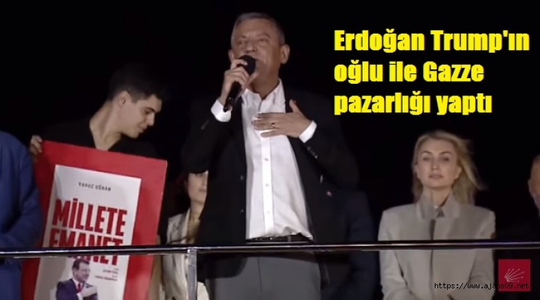 Mitingte konuşan CHP Genel Başkanı Özgür Özel Cumhurbaşkanı Recep Erdoğan'ın geçen hafta cumartesi günü ABD Başkanı Donald Trump'ın oğlu ile Gazze pazarlığı yaptığını iddia etti.
