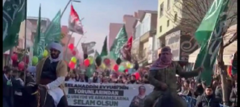 Tevhid bayrağı taşıyan 2 atlı kalabalığa öncülük ederken, eylemciler sık sık "cenk, cihat, şehadet" sloganı attı.