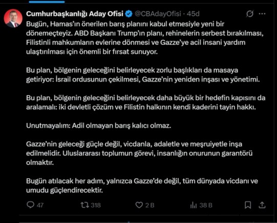 "Bugün, Hamas’ın önerilen barış planını kabul etmesiyle yeni bir dönemeçteyiz. ABD Başkanı Trump’ın planı, rehinelerin serbest bırakılması, Filistinli mahkumların evlerine dönmesi ve Gazze’ye acil insani yardım ulaştırılması için önemli bir fırsat sunuyor.