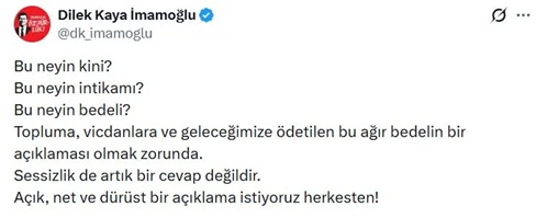 "Bu neyin kini? Bu neyin intikamı? Bu neyin bedeli?" diyen Dilek İmamoğlu yaptığı paylaşımda şunlara yer verdi: