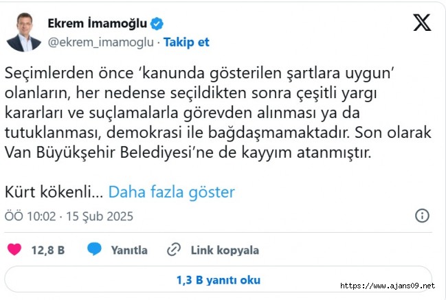 İBB Başkanı Ekrem İmamoğlu, Van’a kayyum atanmasına tepki göstererek, X hesabından şunları kaydetti: