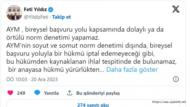 MHP Genel Başkan Yardımcısı "Feti Yıldız, sosyal medya hesabından yaptığı açıklamada: AYM, bireysel başvuru yolu kapsamında dolaylı ya da örtülü norm denetimi yapamaz. AYM’nin soyut ve somut norm denetimi dışında, bireysel başvuru yoluyla bir hükmü iptal edemeyeceği gibi, bu hükümden kaynaklanan ihlal tespitinde de bulunamaz, bir anayasa hükmü yürürlükten kaldırılamaz. Uygulanması imkansız hale getirilemez." dedi.