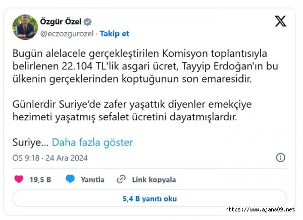“Bugün alelacele gerçekleştirilen Komisyon toplantısıyla belirlenen 22 bin 104 TL’lik asgari ücret, Tayyip Erdoğan’ın bu ülkenin gerçeklerinden koptuğunun son emaresidir. Günlerdir Suriye’de zafer yaşattık diyenler, emekçiye hezimeti yaşatmış, sefalet ücretini dayatmıştır.”