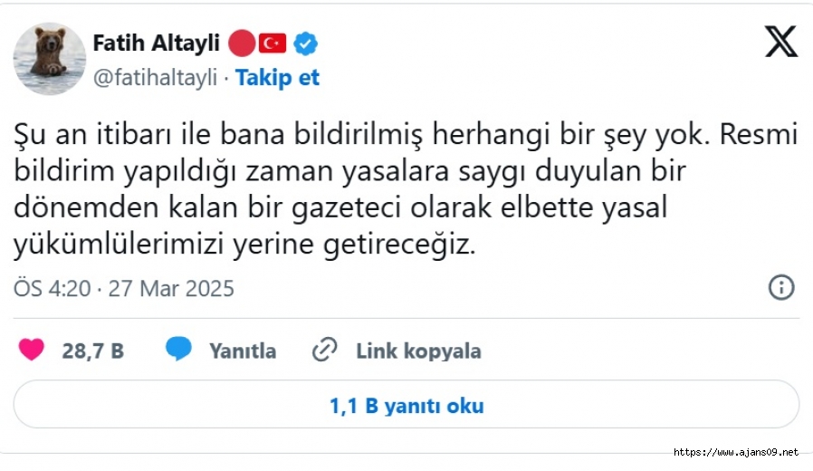 Altaylı, "Resmi bildirim yapıldığı zaman yasalara saygı duyulan bir dönemden kalan bir gazeteci olarak elbette yasal yükümlülerimizi yerine getireceğiz" ifadelerini kullandı.