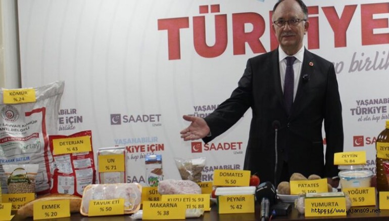 Aynı marka ürünlerin aynı marketlerden bir yıllık fiyat artışlarını takip ettiklerini belirten Kılıç, “Şimdi bir resmi rakamlara, bir de bizim piyasadan derlediğimiz rakamlara bakıyoruz. Arada uçurum kadar fark var. Halk arasında, ‘Ya sayı saymayı bilmiyorsun ya da hiç dayak yememişsin’ diye bir tabir vardır. Nedense iki tabloyu karşılaştırdığımızda aklımıza bu söz geldi.” dedi. Büyük bölümü gıda maddesi olmak üzere zorunlu mal ve hizmetlere ilişkin fiyatlara vurgu yapan Saadet Partili Kılıç, “Şeker yüzde 63, çiçek yağı yüzde 136, zeytin yüzde 84, peynir yüzde 42, un yüzde 71, çay yüzde 30, pirinç yüzde 62, makarna yüzde 38, deterjan yüzde 43, et yüzde 90, tavuk eti yüzde 50, tereyağı yüzde 42, salça yüzde 27, süt yüzde 88, yoğurt yüzde 59, bulgur yüzde 78, mercimek yüzde 100, patates yüzde 100, domates yüzde 50, yumurta yüzde 133, kuru fasulye yüzde 56, kömür yüzde 24, elektrik yüzde 12, doğalgaz yüzde 8, zeytinyağı yüzde 110, ekmek yüzde 20 oranında zamlanmıştır. Gayet açık görüldüğü gibi, temel maddelerdeki ortalama artış yüzde 60’ın aşağısına düşmemektedir. Bir hükümetin görevi gerçeklikten uzak sihirbaz rakamlarla enflasyonu düşük göstermek değil, vatandaşın satın alma gücünü artırmaktır.” ifadelerini kullandı.