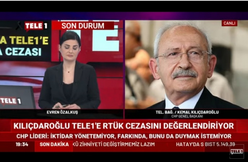 CHP Genel Başkanı Kemal Kılıçdaroğlu, bu akşam TELE 1 televizyonunun Ana Haber Bülteni’ne telefonla bağlantısıyla katıldı. Sunucu Evren Özalkuş’un sorularını yanıtlayan Kılıçdaroğlu, RTÜK’ün TELE 1’e üç gün süreyle verdiği yayın durdurma cezası için şunları söyledi:
