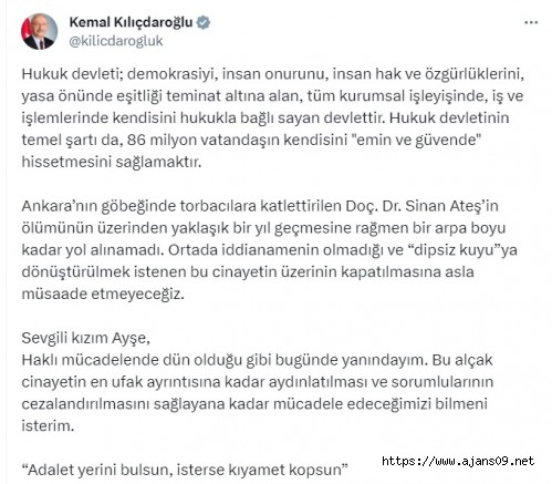 Hukuk devleti; demokrasiyi, insan onurunu, insan hak ve özgürlüklerini, yasa önünde eşitliği teminat altına alan, tüm kurumsal işleyişinde, iş ve işlemlerinde kendisini hukukla bağlı sayan devlettir. Hukuk devletinin temel şartı da, 86 milyon vatandaşın kendisini "emin ve güvende" hissetmesini sağlamaktır. Ankara’nın göbeğinde torbacılara katlettirilen Doç. Dr. Sinan Ateş’in ölümünün üzerinden yaklaşık bir yıl geçmesine rağmen bir arpa boyu kadar yol alınamadı. Ortada iddianamenin olmadığı ve “dipsiz kuyu”ya dönüştürülmek istenen bu cinayetin üzerinin kapatılmasına asla müsaade etmeyeceğiz. Sevgili kızım Ayşe, Haklı mücadelende dün olduğu gibi bugünde yanındayım. Bu alçak cinayetin en ufak ayrıntısına kadar aydınlatılması ve sorumlularının cezalandırılmasını sağlayana kadar mücadele edeceğimizi bilmeni isterim. “Adalet yerini bulsun, isterse kıyamet kopsun”