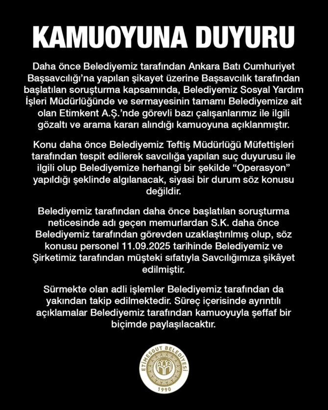 Etimesgut Belediye Başkanı Erdal Beşikçioğlu ise soruşturmanın belediyenin daha önce yaptığı şikâyet üzerine yürüdüğünü belirtti. Beşikçioğlu, sürecin siyasi bir operasyon gibi değerlendirilmemesi gerektiğini söyledi.